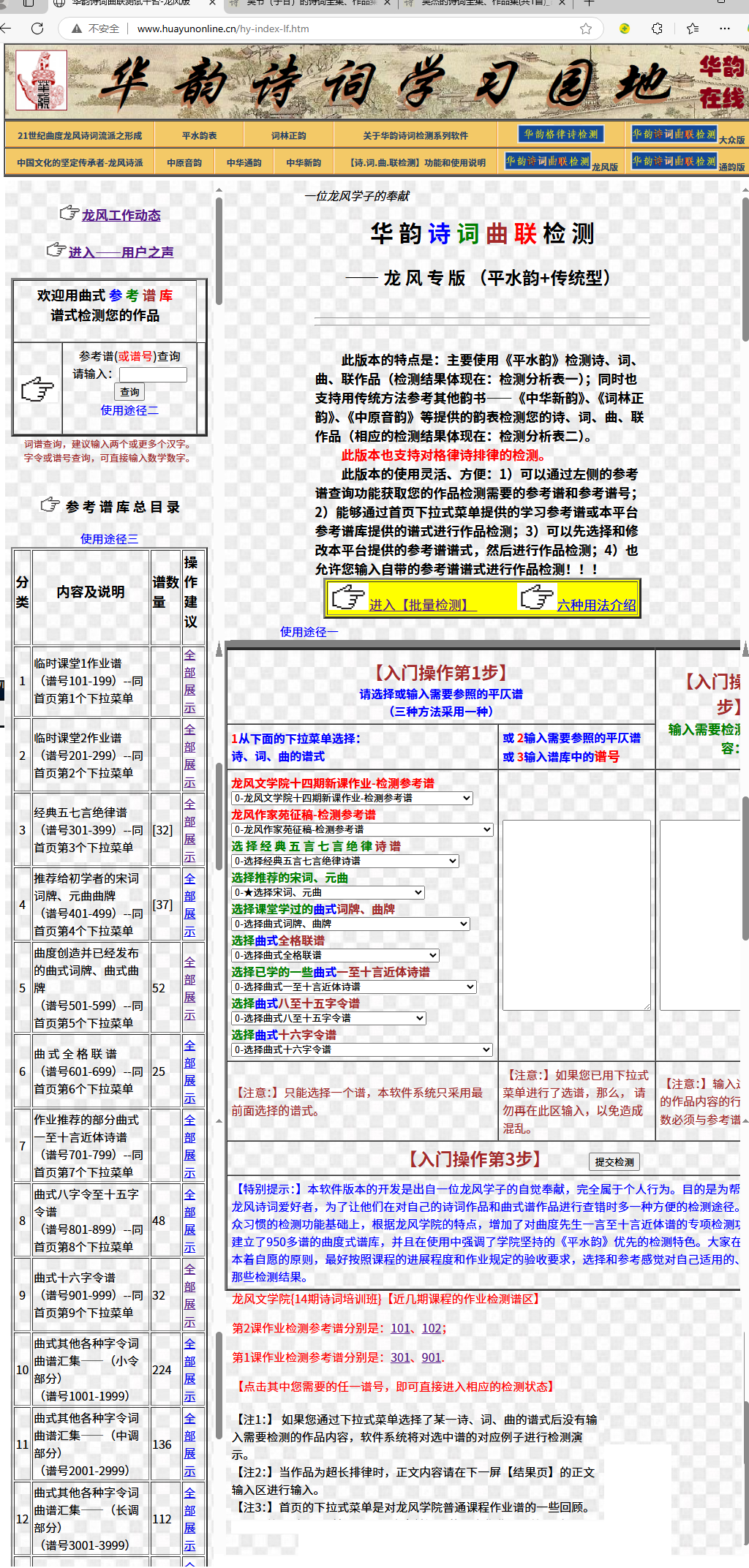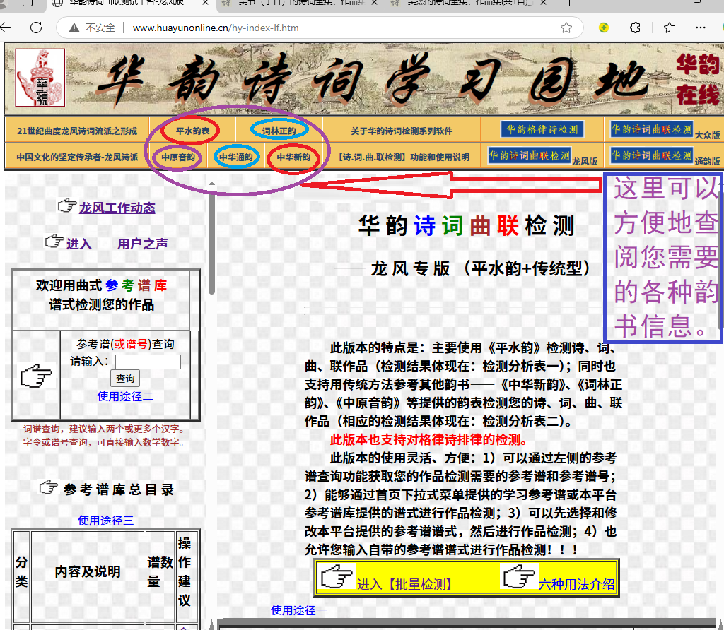本文目录第一章 用网络平台检测诗词作业的必要性及‘[华韵]龙风版’的特点 第一节 我们诗词培训课程为什么在初始课就建议大家熟悉和使用网络上的诗词检测平台(软件)? 第二节 关于‘【华韵诗词曲联检测】龙风版’检测平台及特点 第三节 网络上有许多诗词检测平台,我们为什么要优先向大家推荐‘[华韵]龙风版’? 第二章 '[华韵]龙风版’的网址和启动运行 第三章 龙风学员在首页上获取最新作业检测参考谱的三个途径 第一节 首页上新课作业的检测参考谱存在的第1个位置 第二节 首页上新课作业的检测参考谱存在的第2个位置 第三节 首页上新课作业的检测参考谱存在的第3个位置 第四节 网络平台检测诗词时涉及的【检测参考谱】和【参考谱谱号】 第五节 总结 第四章 快速学会用‘[华韵]龙风版’检测作业的五种方法 第一节 方法1——通过下拉式菜单输入参考谱的操作方法 第二节 方法2——选择首页下方【近几期课程作业检测谱区】中的参考谱【谱号】 第三节 方法3——通过首页左边《参考谱库总目录》选择参考谱的操作方法 第四节 方法4——已知谱号时直接输入谱号的操作方法 第五节 方法5——未知谱号时通过首页左上方的检索功能获取参考谱和谱号的操作方法 第五章 在‘[华韵]龙风版’中怎样查找韵书和使用辅助功能 第一节 ‘怎样在‘[华韵]龙风版’平台中找到《平水韵》《中华新韵》等韵书信息 第二节 使用【辅助功能1】——帮助更换【押韵位置】的字 第三节 使用【辅助功能2】——帮助更换【非押韵位置】的字 附录1、谱库查询的信息输入说明 附录2、 怎样阅读检测分析结果 第一章 用网络平台检测诗词作业的必要性及‘[华韵]龙风版’的特点 第一节 我们诗词培训课程为什么在初始课就建议大家熟悉和使用网络上的诗词检测平台(软件)? 因为,诗词作者写出的作品一般都是要按照特定的格律及押韵要求来进行约束,并且需要用统一的韵书来进行规范的。作品作业稿出来以后,总不免有这样那样(不符合要求)的问题出现,即使有韵书装在口袋里,人脑也没有电脑查的快、查的准确(比起电脑,人脑的误差和遗漏会比较多)。因此,在诗词稿的初步审查阶段,借助网络平台检测,效率会很高,相当于有一个高级老师在身边随时帮您进行快速检测,可以随时检测随时修改,让您的创作事半功倍。另外,这样做了以后,我们的辅导老师就可以将精力重点放在为您推敲文字、对仗以及高层次提高分析方面。 请注意:一首诗词作品,不仅仅押韵字的【韵】要包含在同一个韵书里,非押韵字的【平、仄】也要和其在同一个韵书里的【平、仄】相一致。 大家学习诗词期间,逐步就会发现,使用网络检测平台检验自己的作业既有高效率、高产出,也会不断有高质量、高水平的作品涌现。 第二节 关于‘【华韵诗词曲联检测】龙风版’检测平台及特点 ‘【华韵诗词曲联检测】龙风版’(以下简称‘[华韵]龙风版’),它可以使用四种韵书——《平水韵》、《中华新韵》、《词林正韵》、《中原音韵》等提供的韵表对格律诗、词格、曲格、楹联等作品提供以平、仄、韵为主的检测分析,并且依据作品的特点产生相应韵表下的检测结果。特别是‘[华韵]龙风版’,既融合了龙风学院诗词教学的特殊要求,也包含了曲度先生诗词谱式的特点。 第三节 网络上有许多诗词检测平台,我们为什么要优先向大家推荐‘[华韵]龙风版’? 有四方面理由: (1)比起网络上已有的诗词检测平台,‘[华韵]龙风版’在开放式词谱方面有3种创新: 1-1)允许用户在左输入框【修改】谱库里已有的谱,然后再进行检测; 1-2)允许用户在左输入框【输入】自己带来的谱,然后再进行检测; 1-3)用户在左输入框直接【写入】本平台谱库里己有谱的谱号,然后直接进行检测。 ‘[华韵]龙风版’的这3种创新,能够保证我们龙风学院学员的曲度式谱的诗词作业在检测时不会象去其它平台那样遇到被拒之门外的情况。 (2)‘[华韵]龙风版’还有两项功能是专门为我们龙风设计的: 2-1)专门设置了将曲度一言至十言作为格律诗检测的特定处理方式(其它网络平台会认为这些是词作品); 2-2)建立了曲度先生8字令至124字令的800多个诗词谱的谱库,是专门为龙风教学量身定制的。其它网络平台不具备,所以无法支持对我们用曲度谱式写的作品作业的检测。 (3)由于我们曲度先生和龙风学院的教学要求,所有作业作品坚持用《平水韵》《中华新韵》和《平水韵邻韵》检测,‘[华韵]龙风版’体现了《平水韵》优先原则。 (其它平台都是采用社会上习惯的传统方式:诗用《平水韵》检测,词用《词林正韵》检测,曲用《中原音韵》检测。) ‘[华韵]龙风版’在沿用传统方式的基础上,采用了多形式检测,侧重了体现了平水韵优先的原则。也就是说:检测结果有依据《平水韵》的,也有依据其它韵书的,【但是】,《平水韵》的检测结果显示在最前面,以满足龙风教学中老师和同学们的要求和使用习惯。 (4)开创了【批量检测】功能,实现一次提交可以检测几十首同谱或不同谱的诗词作品。因为期末的两场考试每一场都要写14首以上作品。学员创作量和检测量都非常大,老师审核验收的检测量也非常大,所以【批量检测】的功能是必不可少的检测辅助。(其它网络平台没有这个功能) 第二章 [华韵]龙风版’的网址和启动运行 