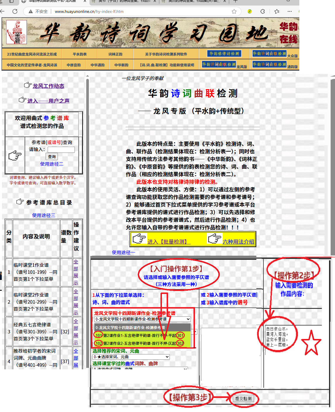 第四章 快速学会用‘[华韵]龙风版’检测作业的五种方法 第一节 方法1——通过首页第一个下拉式菜单选择检测参考谱的操作方法 此方法可以看作是【新手使用方法1】。 在屏幕已经出现本检测软件首页的情况下,如果用户知道其作品检测需要的参考谱已经在本平台下拉式菜单中存在,希望通过下拉式菜单可以选择参考谱,可以进行以下的3步操作: 1)在希望的下拉式菜单点选需要的参考谱(格律诗的诗谱在第3个下拉式菜单,我们的例子是在第对应的参考谱是第2谱,谱号302); 2)在第2输入区“作品输入区”输入需要检测的诗词作品正文;(此步骤也可以忽略,在下一页面【演示检测的结果页】再输入) 3)点击【提交检测】,然后,系统就可以执行检测任务。 三个操作步骤参见下图。