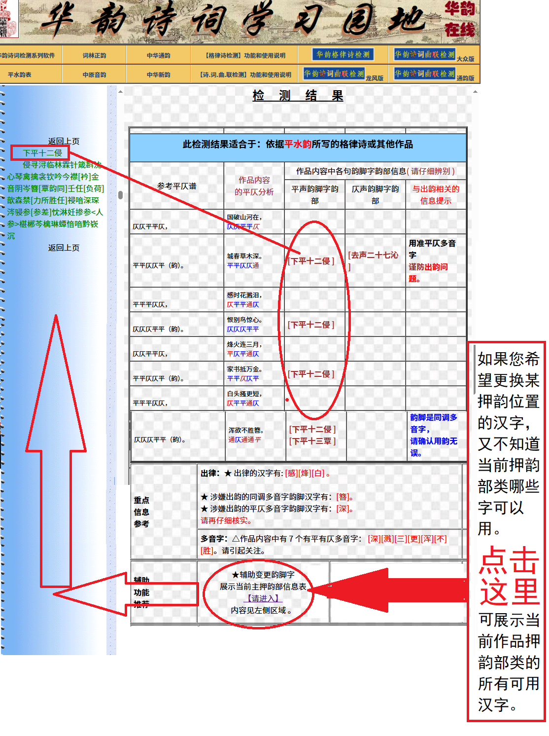 点击这些位置‘韵书’的网址连接,查阅韵书非常方便。这样,您就不必在检测期间退出本平台到别的平台找【韵书】类信息了。 第二节 使用【辅助功能1】——帮助更换【押韵位置】的字 在检测结果页,我想换【押韵位置】的字,在哪里找参考信息?