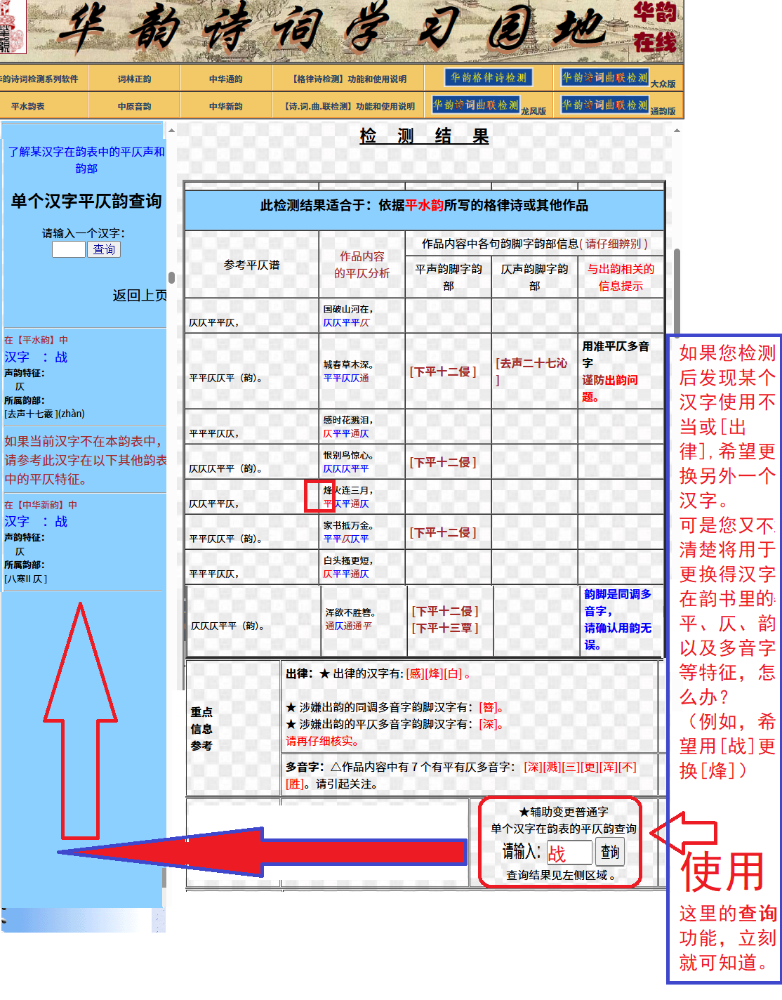 第三节 使用【辅助功能2】——帮助更换【非押韵位置】的字 在检测结果页,如果要更换【普通位置】的字,怎样查欲换字的平、仄、韵以及多音字等特性?很简单,按照下图的提示操作,即可。