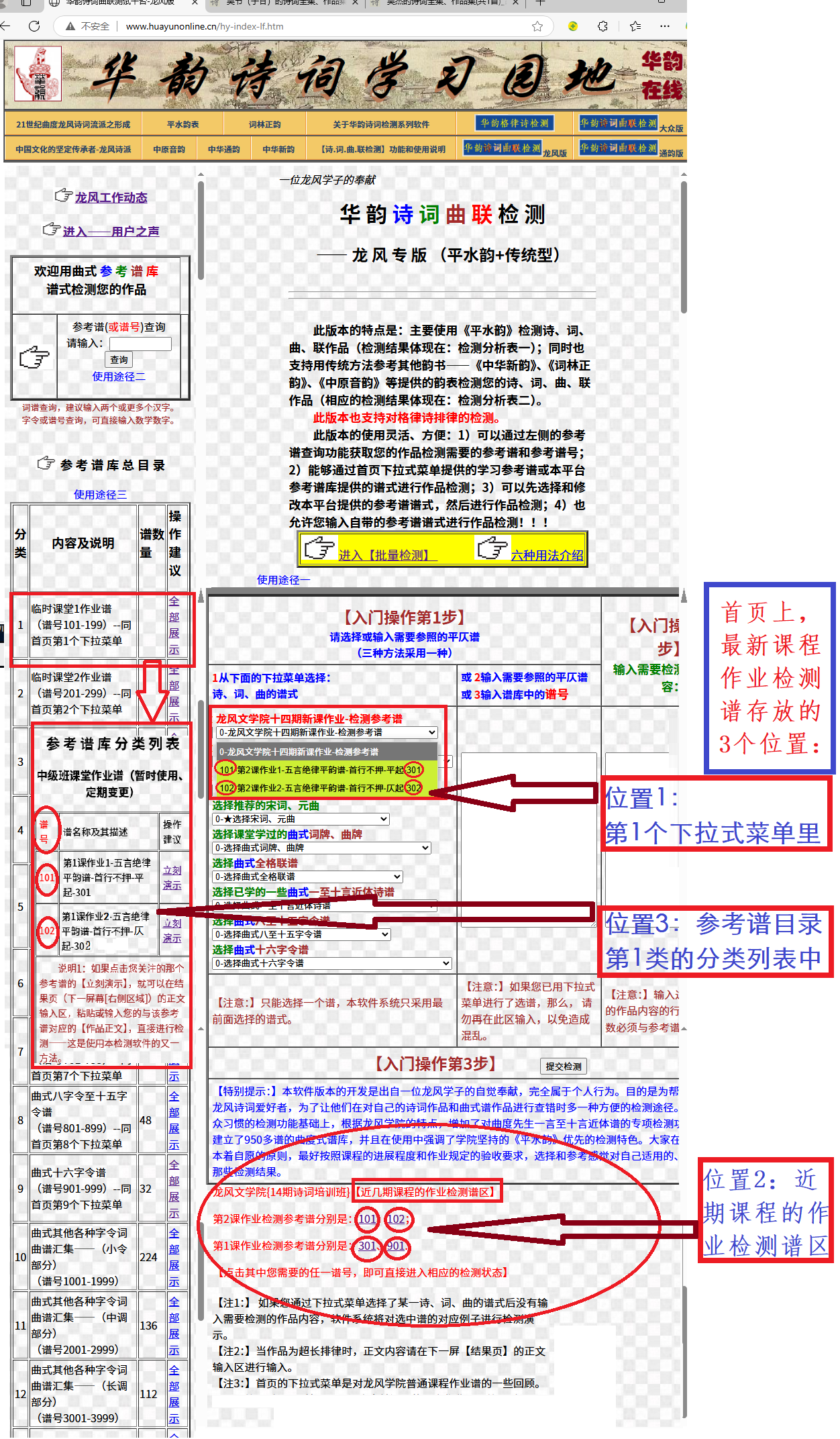 【注意】当您点了需要的检测谱右端的【立刻演示】,然后,系统将自动对其谱附带的例诗进行演示性检测,您可以在其后的【结果页】状态下再粘贴要‘检测的诗词正文’进行正式的检测。 第四节 网络平台检测诗词时涉及的【检测参考谱】和【参考谱谱号】 (1)【检测参考谱】的作用 在使用网络平台检测诗词时,系统判断您的诗词中汉字的平、仄、韵是否符合规定,需要有一个审核标准,这个审核标准就是您写诗时所遵循的诗词【谱】,检测平台称之为【检测参考谱】。系统将【检测参考谱】作为检测诗词的参照系,评判存在的问题。 几乎所有功能强的诗词检测平台都会建立庞大的参考谱谱库,存放着大量自古以来的格律诗谱、宋词词牌谱、元曲曲牌谱。目前,我们‘【华韵】龙风版’诗词检测平台就建立了有3715种诗词谱构成的参考谱库,其中除了格律诗谱、宋词词牌谱、元曲曲牌谱外,还包含了曲度先生创造的955种诗词谱。 (2)参考谱【谱号】的作用 由于【参考谱谱库】内容多,很难分辨和提取(大多数谱有一种正格体,还有若干个变格体),为了能够方便地管好、用好【参考谱谱库】的资源,我们为每一种谱做了数字编号,称为【谱号】,以利于用户使用和计算机识别 (3)【参考谱谱号】的举例 以下拉式菜单为例进行说明。在第一个下拉式菜单里每行代表一种作业的检测参考谱,在行首有数字作为开头,此数字是该类作业检测的【临时谱号】;在行末也有数字作为结尾,此数字是该类作业检测的(在本平台谱库里的)【永久谱号】。【临时谱号】或【永久谱号】都可以检测相同的作业。 到目前为止,通过【谱号】方式管理谱库资源和提供检测服务是比较好的运行方式之一。 第五节 总结 以上,之所以在首页上用3个位置存放‘最新课作业检测谱’,就是为了给同学和老师们的作业检测提供快捷方式和便利途径。 下图可以让您一目了然地查看新课作业检测谱的3个位置。