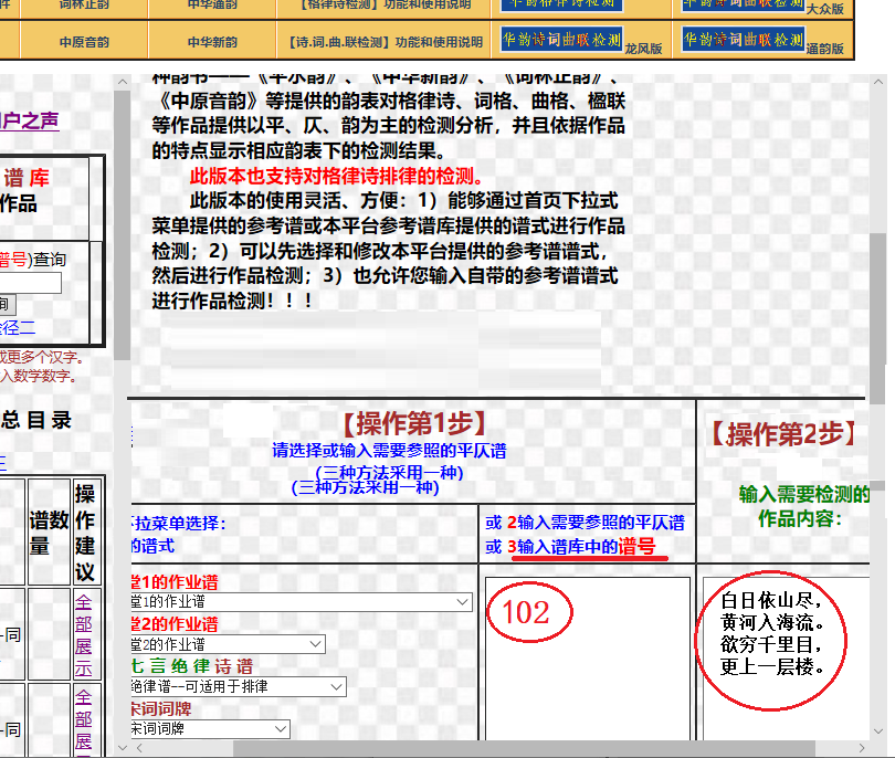 从此图中谱库第1类细目列表与第1个下拉式菜单比较来看,它们是一 一对应的,内容完全一样。 第四节 方法4——已知谱号时直接输入谱号的操作方法 已知谱号,直接输入谱号的操作方法,可看作是【高手使用方法1】。 在屏幕已经出现本检测软件首页的情况下,如果用户已经知道自己的作品对应在平台谱库中的参考谱谱号,可以进行以下的3步操作: 1)【操作第1步】:在左边输入区(参考谱输入区)输入已知的参考谱号(我们的例子检测需要的参考谱号是102,这里输入102即可。(有人会问,你这参考谱号102是从哪里得到的?可能是老师告知的、或好友告诉的,也可以是通过检索查询得到的。) 2)在第右边输入区“作品输入区”输入需要检测的诗词作品正文; 3)点击【提交检测】,然后,系统就可以执行检测任务。 参见下图。